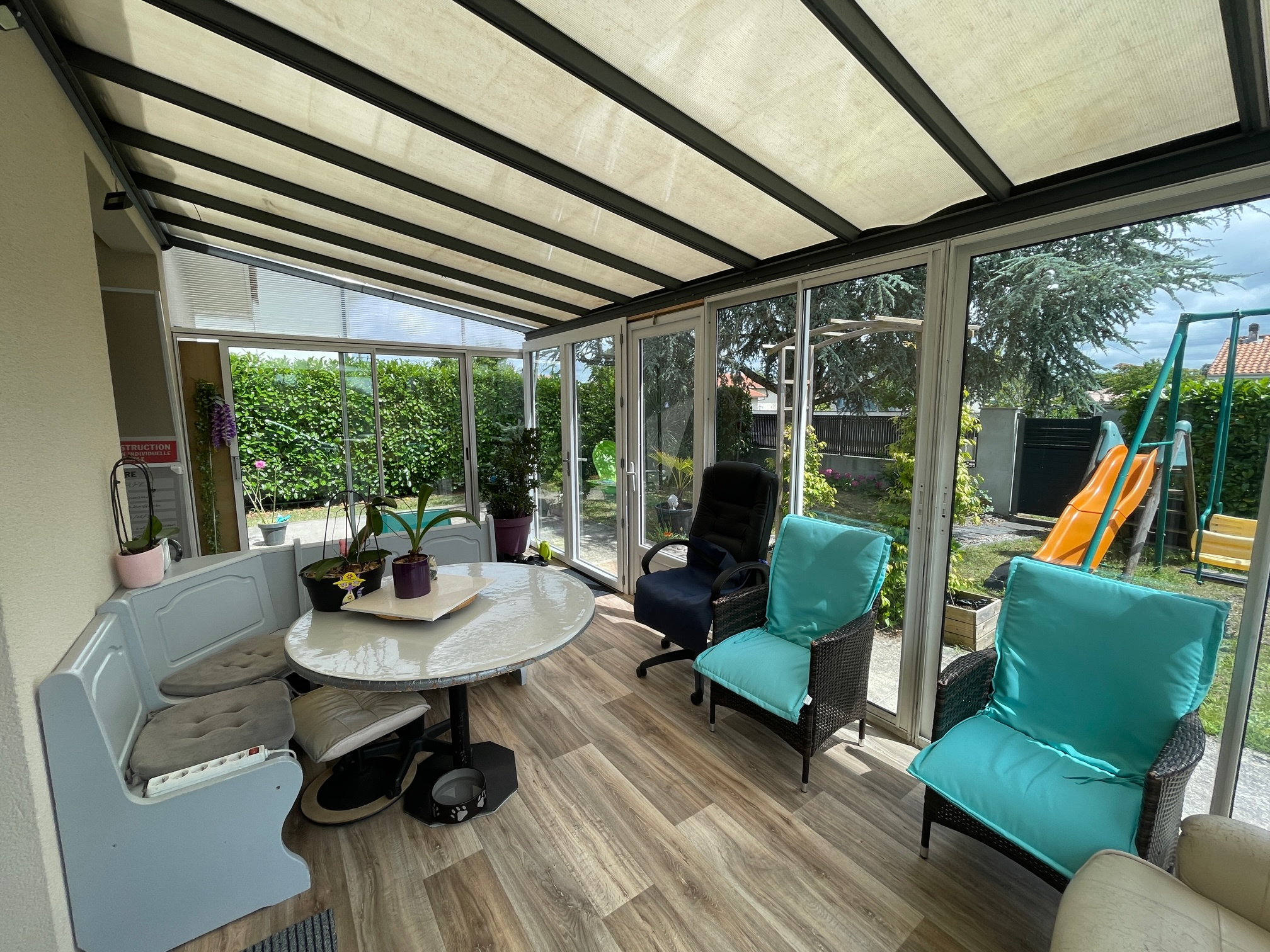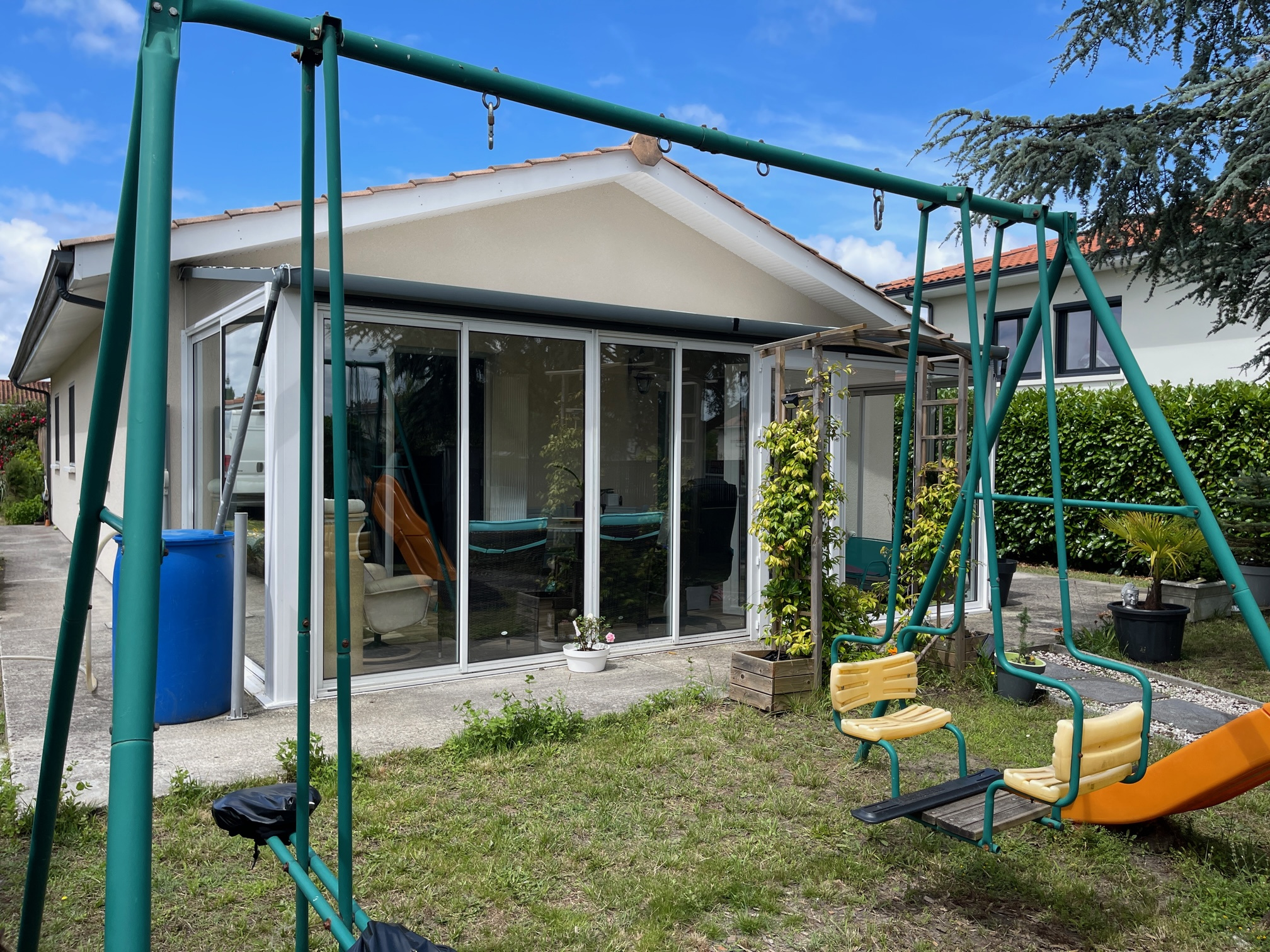 A VENDRE. Belles prestations et très bon état pour cette maisons dans un secteur calme et proche des commodités, normes PMR de plain pied sans travaux, construite en 2013, surface habitable 89m2 + véranda 18m2. Elle est composée de 3 chambres avec rangements, pièce de vie lumineuse avec sa cuisine ouverte (électroménager récent), cellier, salle d'eau, wc indépendant, véranda, garages, piscine hors sol, sur un jardin clos d'environ 766 m2 à BIGANOS 33380