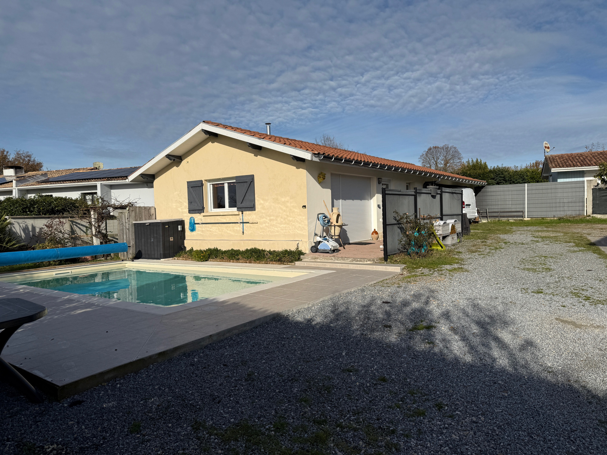 A Mios et en EXCLUSIVITE, maison de type T2 avec 1 chambre, séjour/cuisine, sde et wc, double abri voiture, piscine 7m x 3,70m, jardin d'environ 430m2, toutes commodités à pieds ! Bien exonéré de DPE car inférieur à 50m2 habitable.